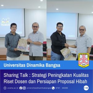 Dalam upaya meningkatkan kualitas riset dan jumlah publikasi serta meningkatkan kemampuan para dosen/peneliti Universitas Dinamika Bangsa dibawah pengelolaan Lembaga Penelitian dan Pengabdian Masyarakat (LPPM), Mengadakan kegiatan ” Sharing Talk : Strategi Peningkatan Kualitas Riset Dosen dan Persiapan Proposal Hibah”, serta Sosialisasi dari Lembaga Penelitian Pengabdian Masyakarat (LLPM) Universitas Dinamika Bangsa pada: